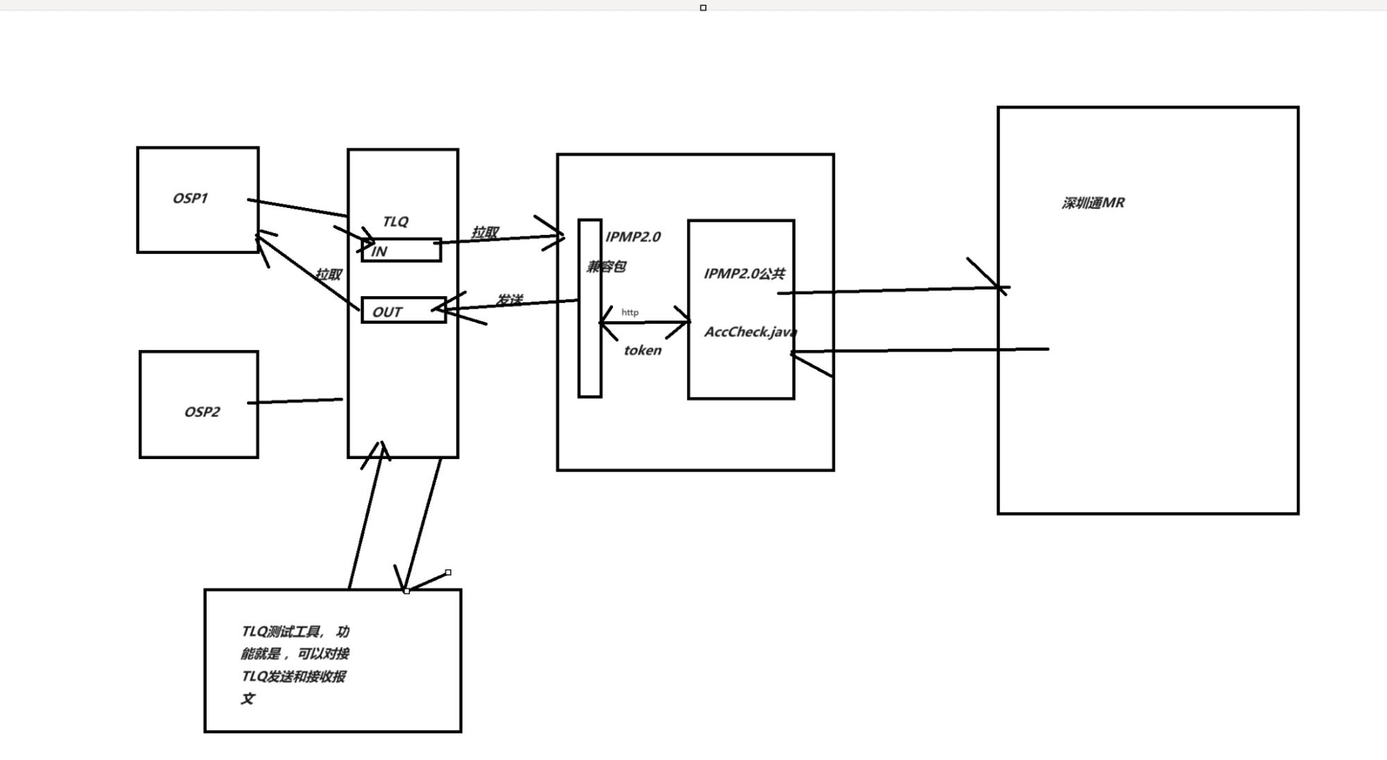 上游OSP通过TLQ(消息队列)跟统一支付2.0交互,统一支付2.0会修改ID之类的内容之后与深圳通MR交互,反方向也类似,深圳通MR会不定时发送报文到 统一支付2.0,然后统一支付2.0需要把这个报文丢到TLQ里